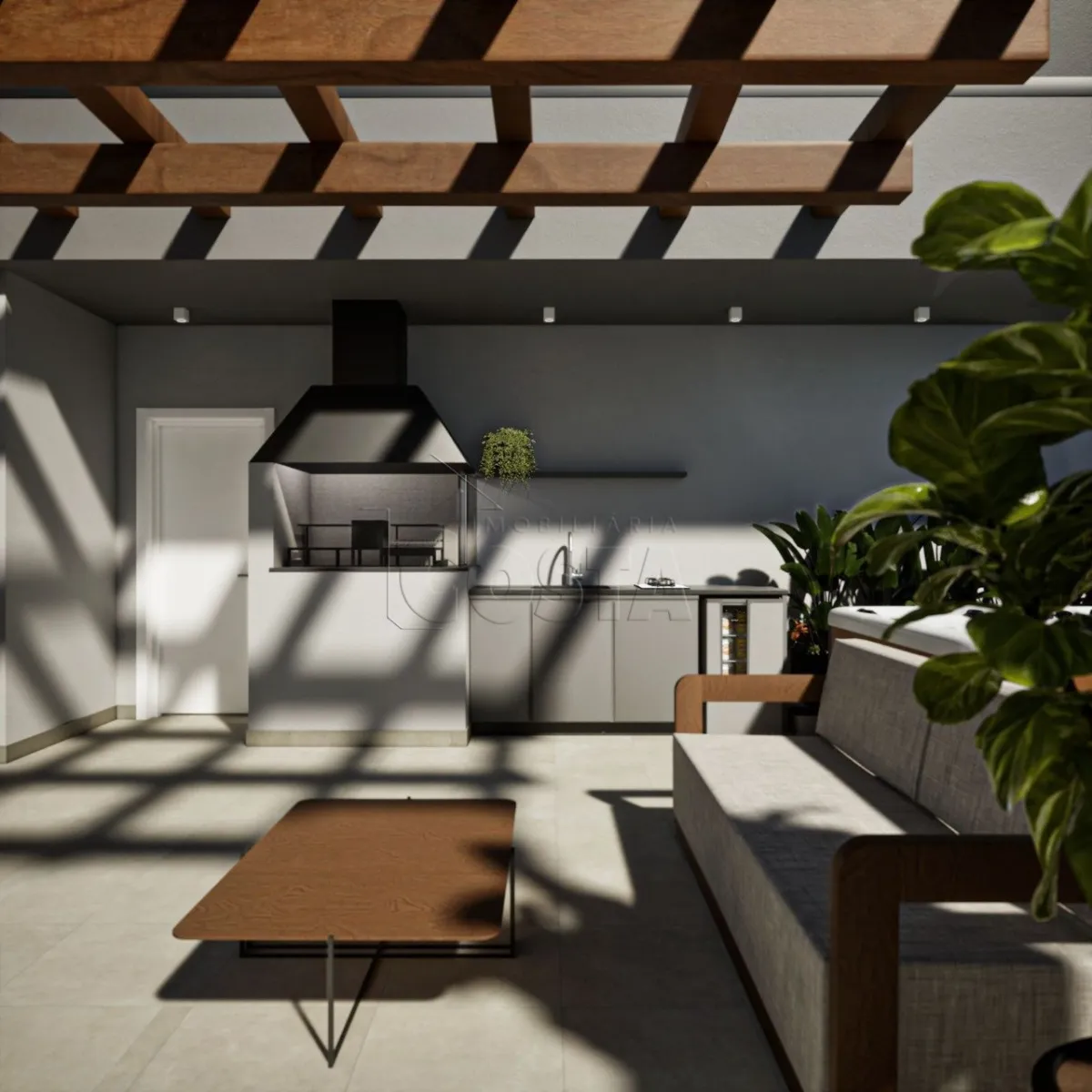 Espaço gourmet externo com churrasqueira à carvão, pergolado de madeira e SPA para 6 lugares, entregue mobiliado.