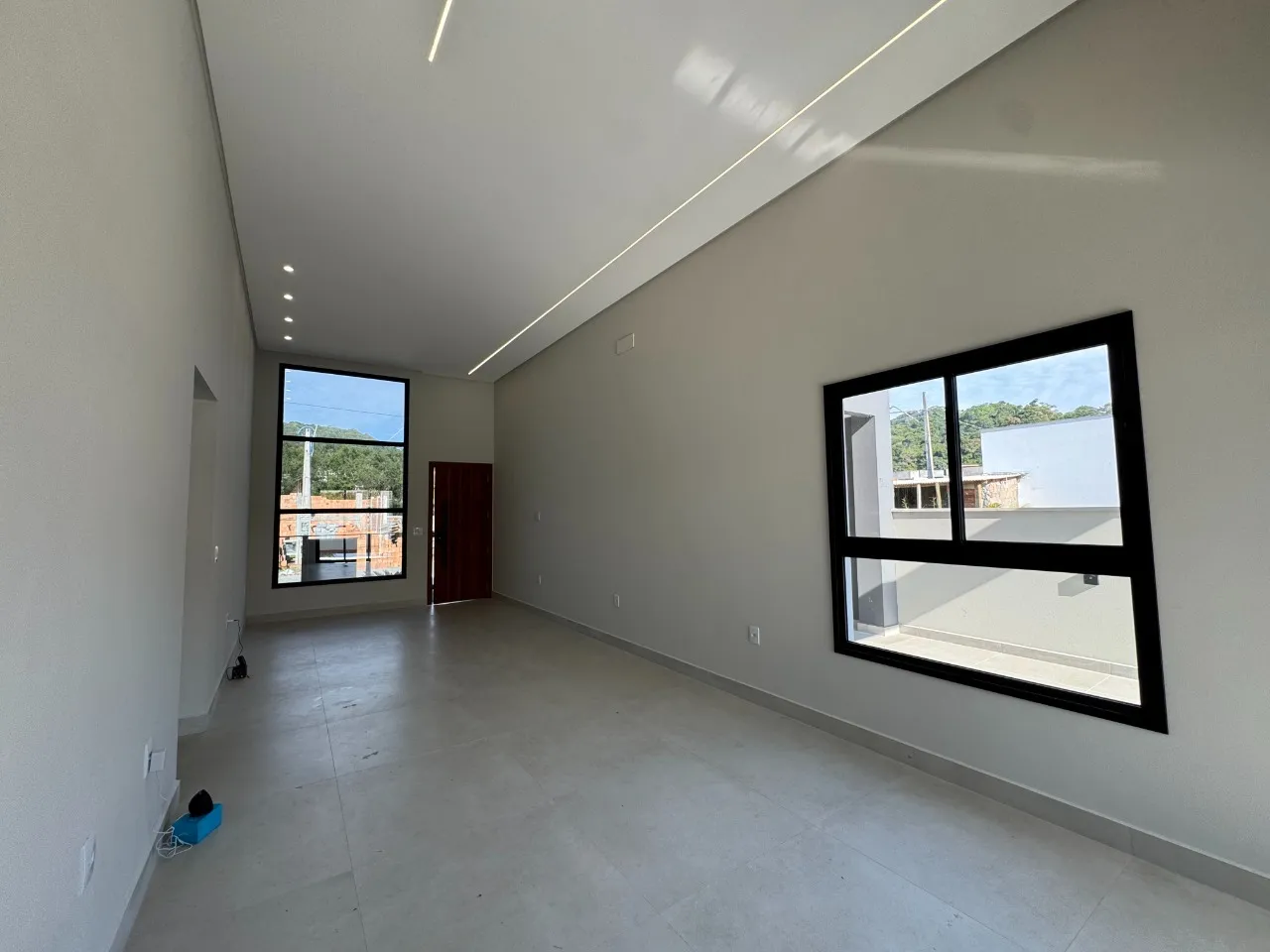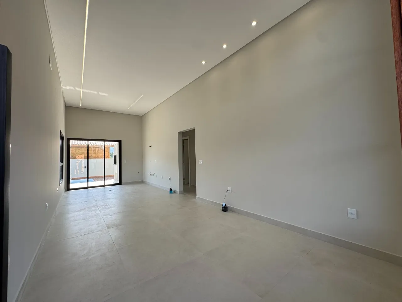 Sala e cozinha em conceito aberto e pé direito alto e gesso