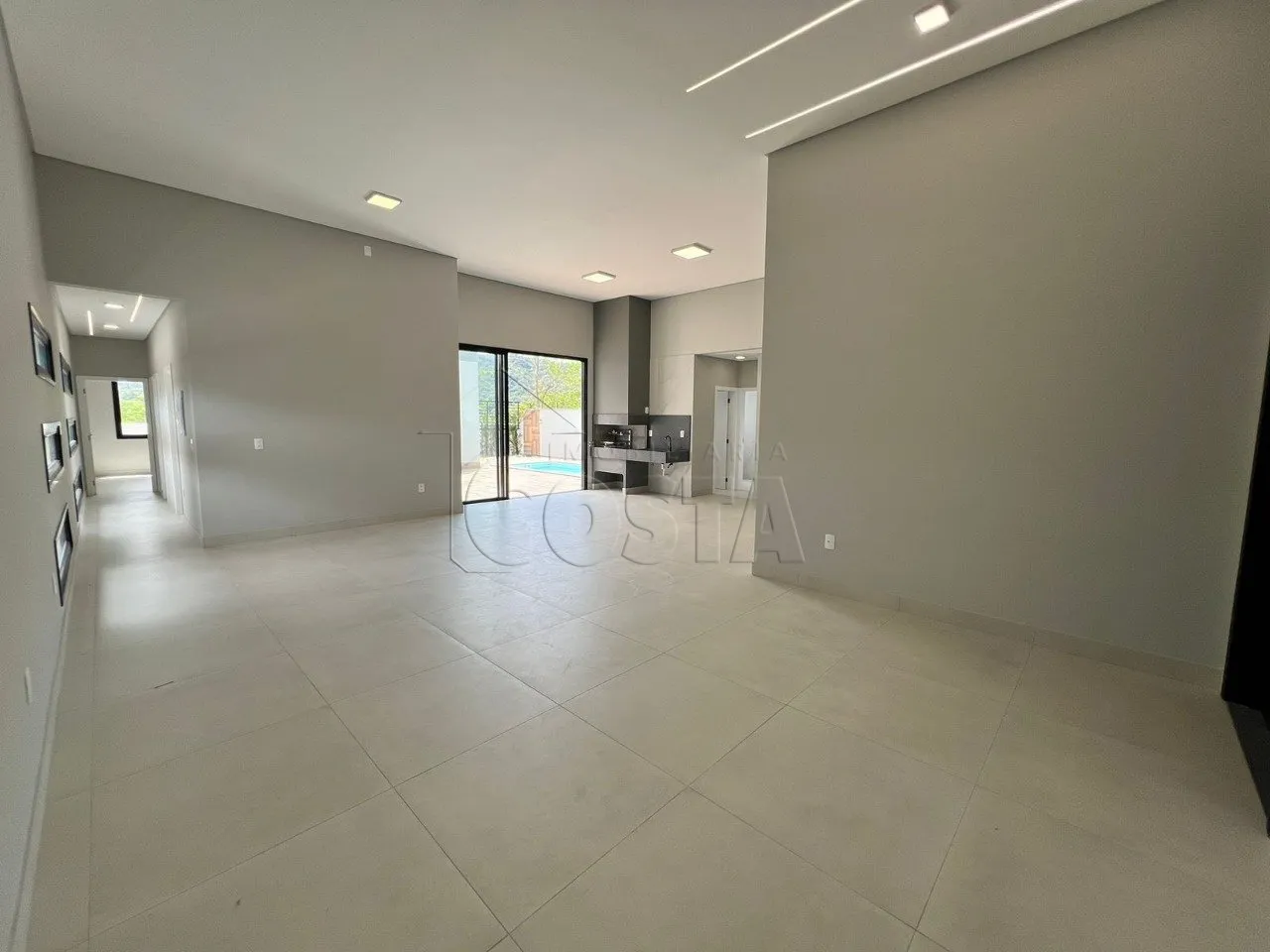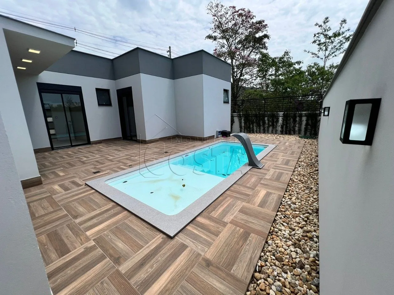 CONDOMÍNIO RESERVA DA PEDRA Casa térrea com 3 quartos (sendo 1 suíte)1 banheiro social1 lavabo, área de serviço, sala, cozinha e área gourmet todas integradas. Garagem para 2 carros, hobby box junto a garagem.Casa construída alvenaria convencional, com estrutural em sapata isolada.Laje treliçada no baldrame e cobertura com isopor; paredes em tijolo cerâmico, chapisco e reboco com areia e veda reboco (não utilizo argamassa); cobertura com telha fibrocimento 6mm, calha em concreto e alumínio.Detalhes, área social (sala/cozinha/área de churrasco) com pé direito de 4,0m, demais áreas com 2,90mParte interna da casa rebaixada em gesso acartonado, janelas em alumínio preto com vidro incolor, sendo que nos quartos as aberturas possuem persiana integrada automatizada (instalação das aberturas de alumínio feitas pela empresa Casa com Vidro); portas em madeira laminadas em angelim, sendo aplicado massa e pintas em branco; todas as áreas internas da casa ficam instalados tubulação de hidráulica para água quente e fria (água quente com uso de tubulação PPR), nos banheiros e no lavabo será instalado vaso sanitário com caixa acoplada, no banheiro da suíte fica espera para 2 chuveiros na área do box; nos quartos e sala/cozinha/área gourmet fica ponto para instalação de ar condicionado; a parte elétrica fica toda instalada e nos ambientes será colocado paflon LED sobrepor, e na fachada será feito instalação de fita de LED.Revestimento do chão, utilizado piso porcelanato Eliane 84x84, nas paredes, utilizado revestimento porcelanato portinari 90x90; piscina em fibra na cor branca com dimensão 6,00m(comprimento) X 2,50m(largura) X 1,40m(profundidade), com prainha, da marca IGUI/SPLASH, no entorno da piscina, feito contrapiso com aplicação de revestimento antiderrapante Eliane 60x60, com área de 40,00m², e nas demais áreas será colocado pedrisco, sendo que será instalado dreno no terreno para reduzir a umidade no mesmo. Pintura será feito com tinta de primeira qualidade, da marca coral, sendo que na parte interna, aplicado massa corrida antes da tinta. Na parte da frente da casa, feito a jardinagem com instalação de grama e algumas espécies de ornamentos de pequeno porte (buchos, policarpos e cica).Casa com 174m2 + área piscina.Terreno com 375m2.