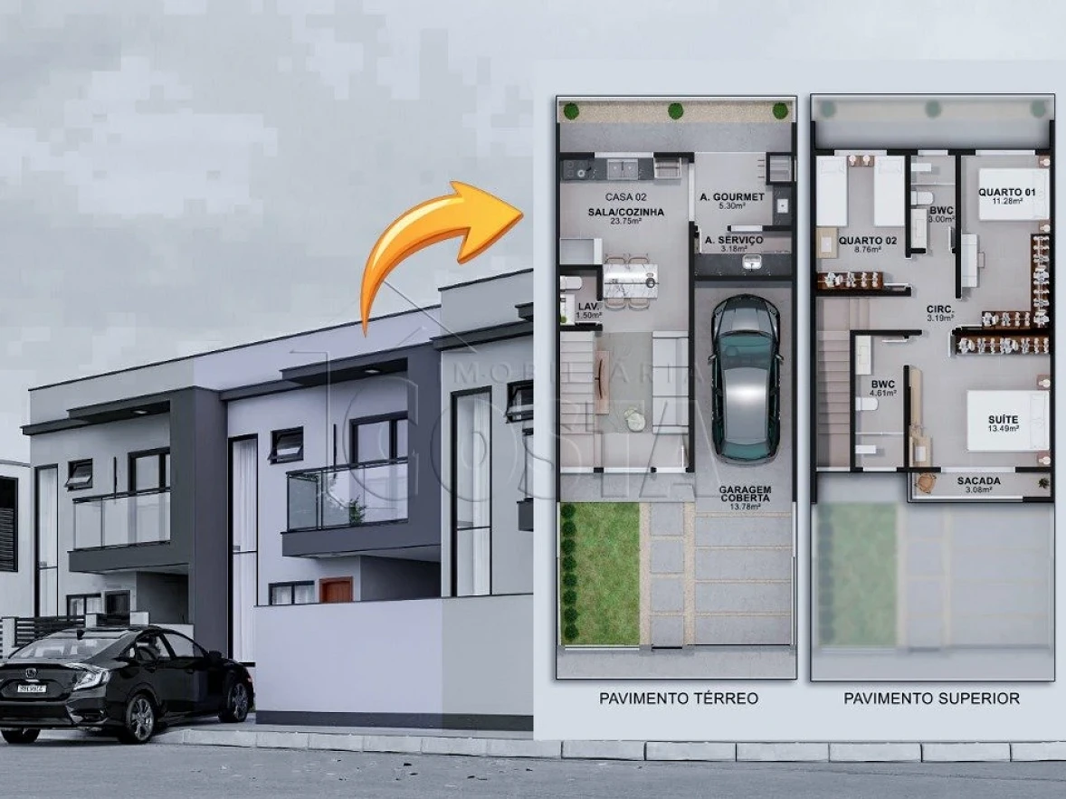 Sobrado geminado 3 quartos em Loteamento Alta Vista, São José com 123m² e 1 suíte master. O imóvel possui 3 dormitórios sendo 1 suíte, 2 banheiros completos e 1 vaga de garagem coberta. A distribuição dos ambientes oferece sala de estar, cozinha planejada e área de serviço funcional.