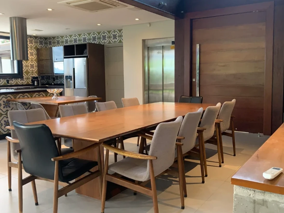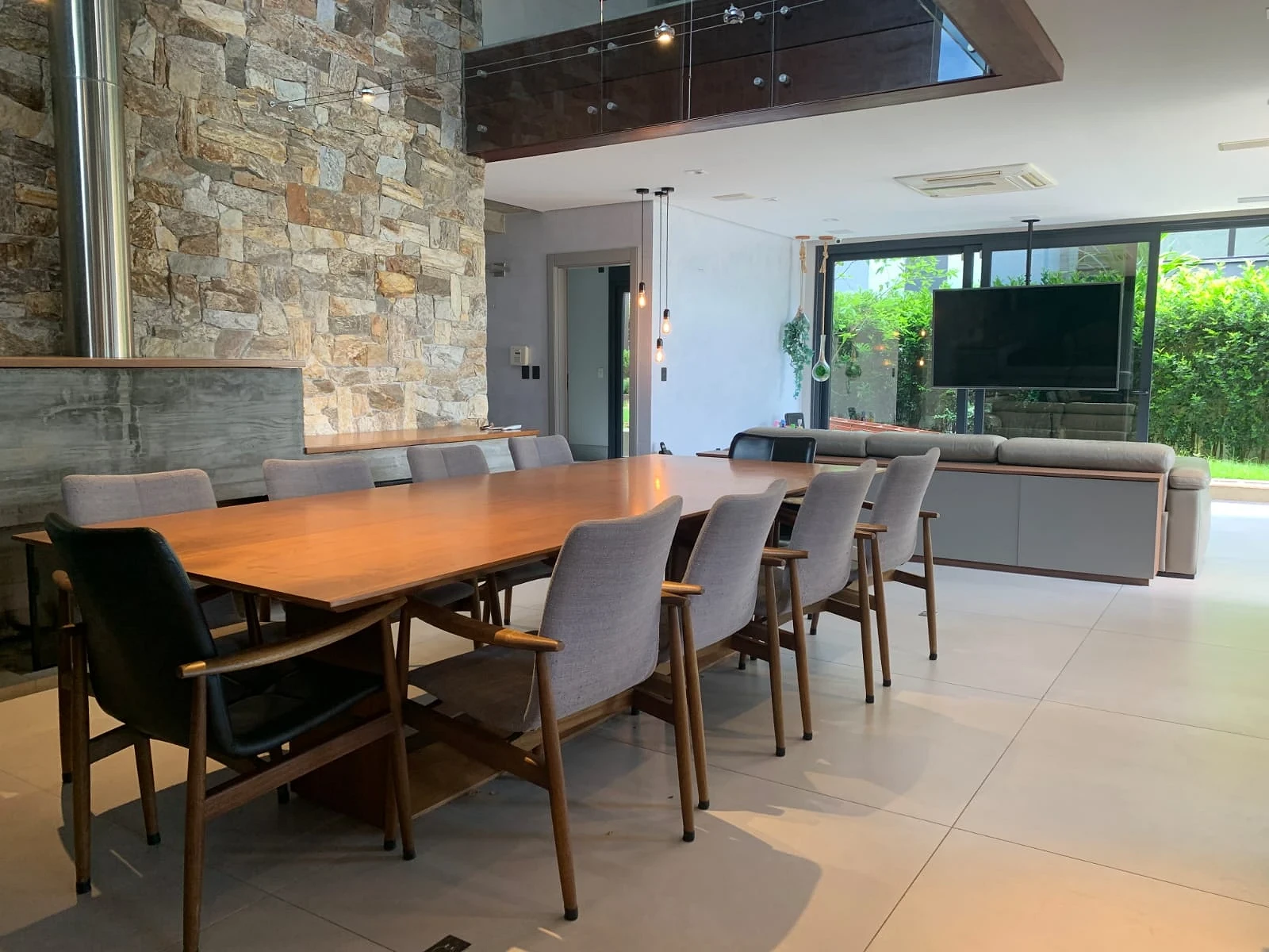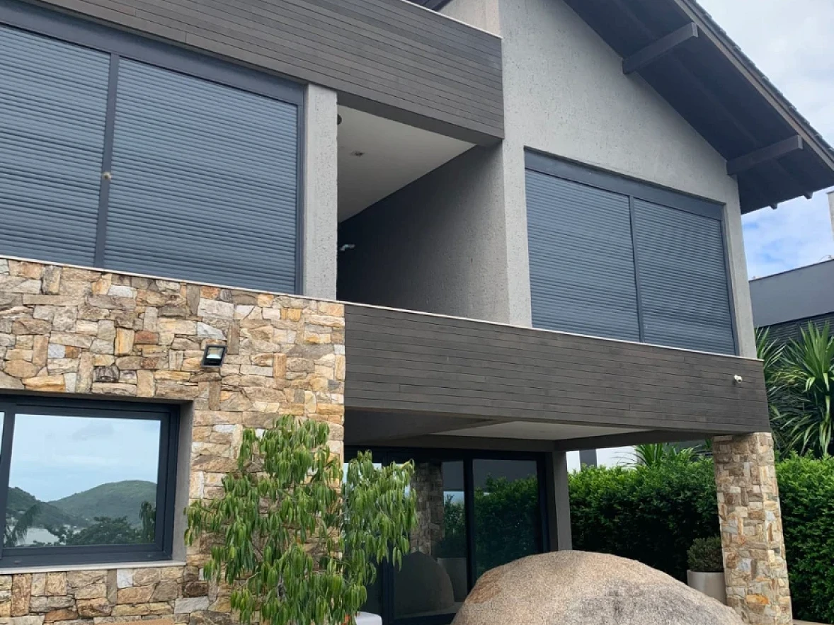 Todos os ambientes são climatizados, com persianas automatizadas e grandes aberturas que garantem excelente iluminação natural. Um projeto que une estilo rústico e moderno, com detalhes em pedra, teto em madeira no pavimento superior, pé-direito alto e mezanino integrando os andares.