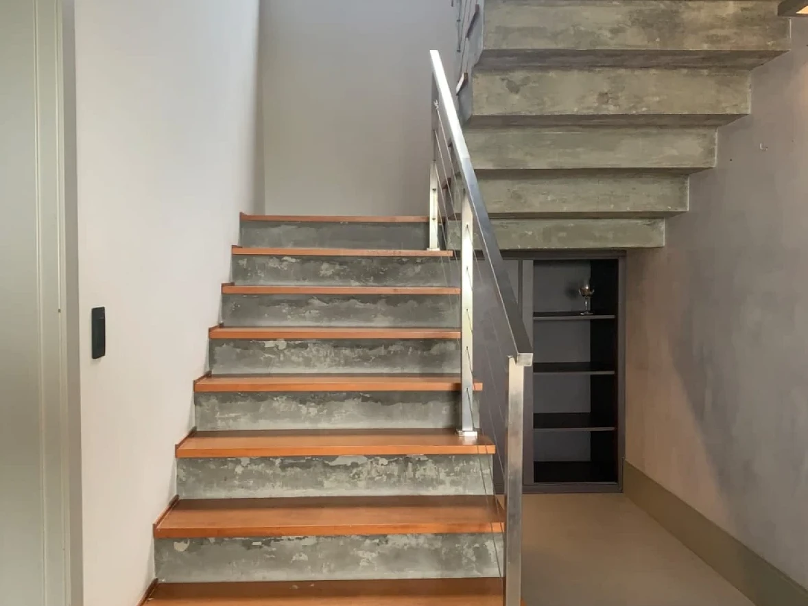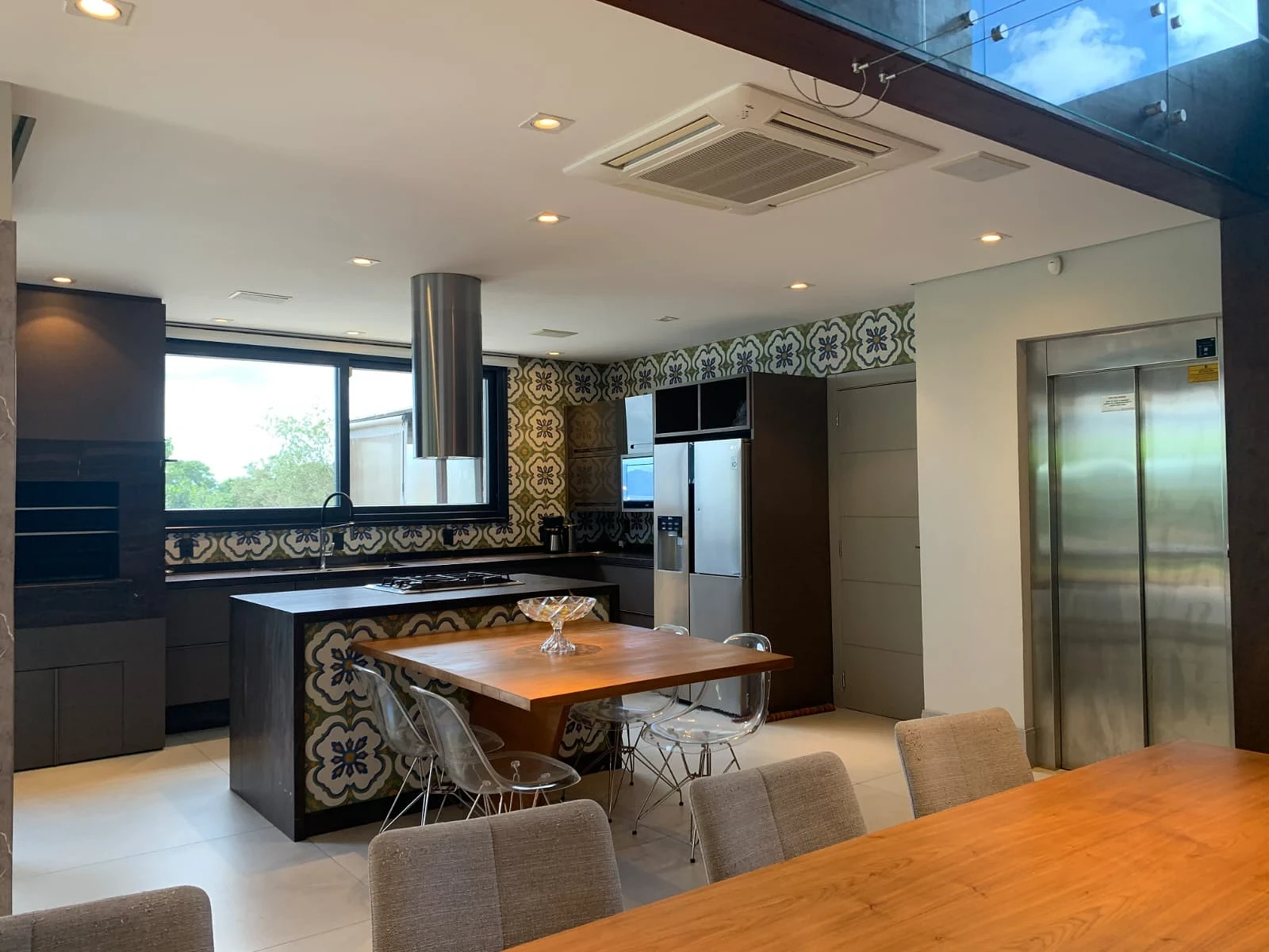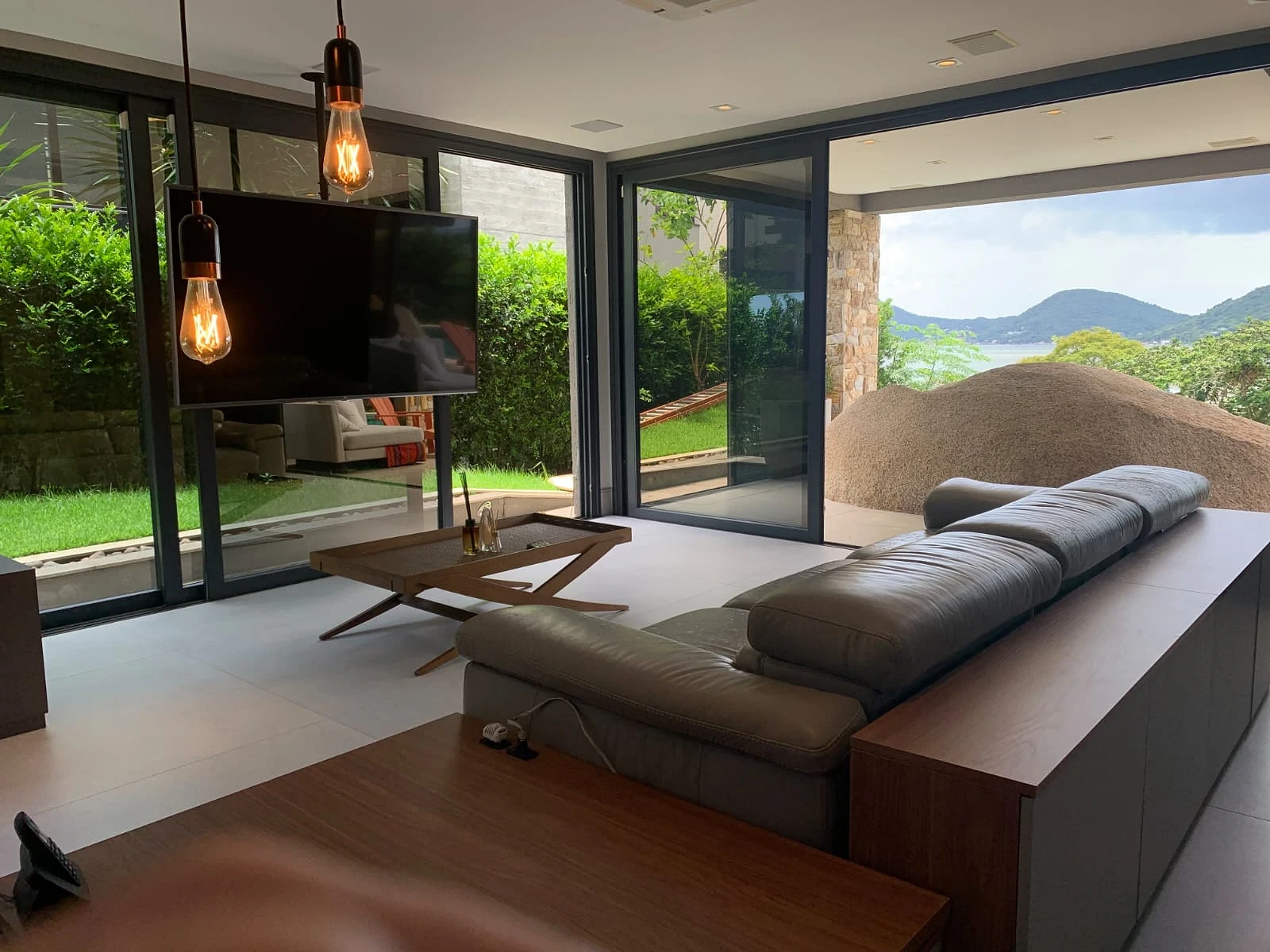 Todos os ambientes são climatizados, com persianas automatizadas e grandes aberturas que garantem excelente iluminação natural. Um projeto que une estilo rústico e moderno, com detalhes em pedra, teto em madeira no pavimento superior, pé-direito alto e mezanino integrando os andares.
